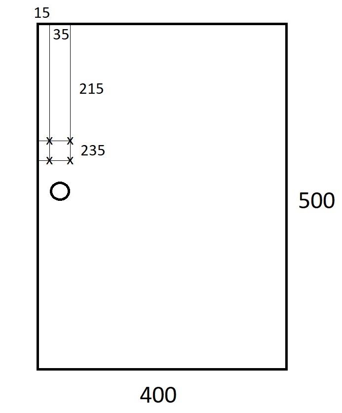 1. Na dvierka boxu si vyznačte 4 krížiky, kde budete neskôr vŕtať dierky. Krížiky vyznačte nad mechanickou zámkou, ktorá sa už nachádza na vašom boxe. Pri vyznačení krížikov dodržte rozmery, ktoré sú uvedené na obrázku vedľa.