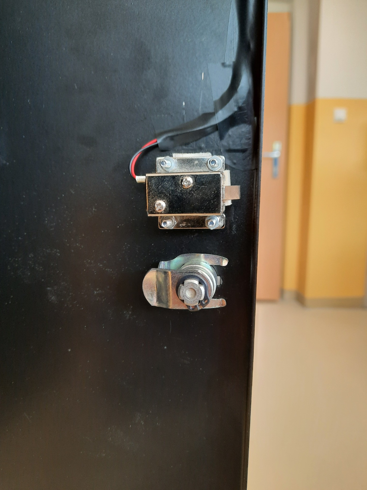 4. Elektronický zámok priskrutkujte z vnútornej strany dvierok tak, aby jazýček zámku smeroval k vonkajšej strane dvierok.