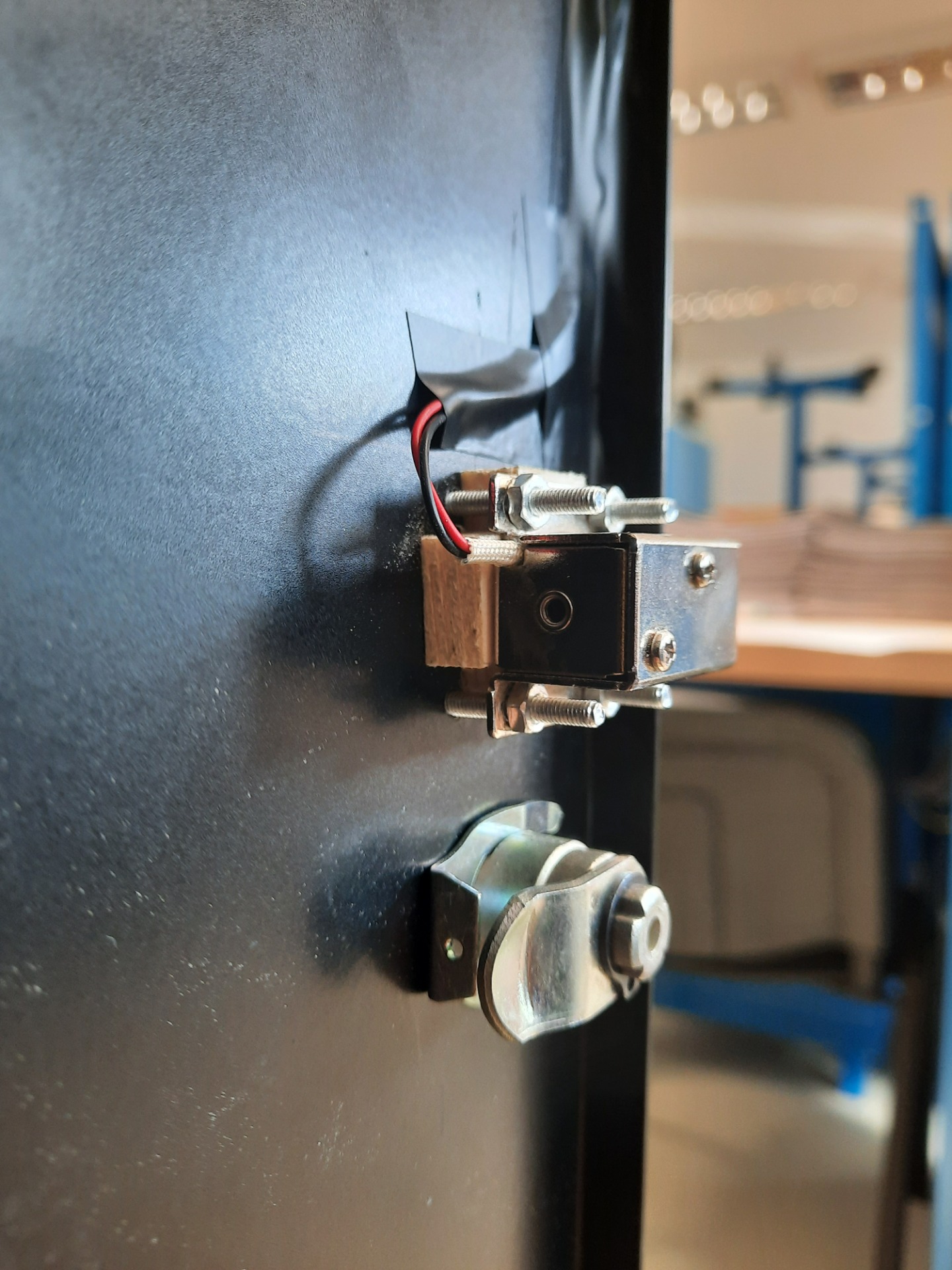 Elektronický zámok (Solenoid zámok 12 V / 24 V), tenkú ceruzu alebo fixu (farba ceruzy alebo fixy musí byť viditeľná na čiernom plechu), pravítko, tenký vrták do kovu (priemer 3 mm), vŕtačku, podložku z dreva (rozmery 40x40x25 mm), 4 skrutky s matkami (hrúbky 3 mm, dĺžka 15 mm), skrutkovač.